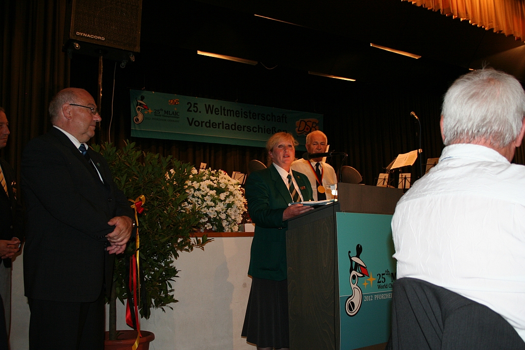 Corena accepting the MLAIC flag on behalf of South Africa for hosting the 26th MLAIC World Championships in South Africa in 2014 |