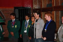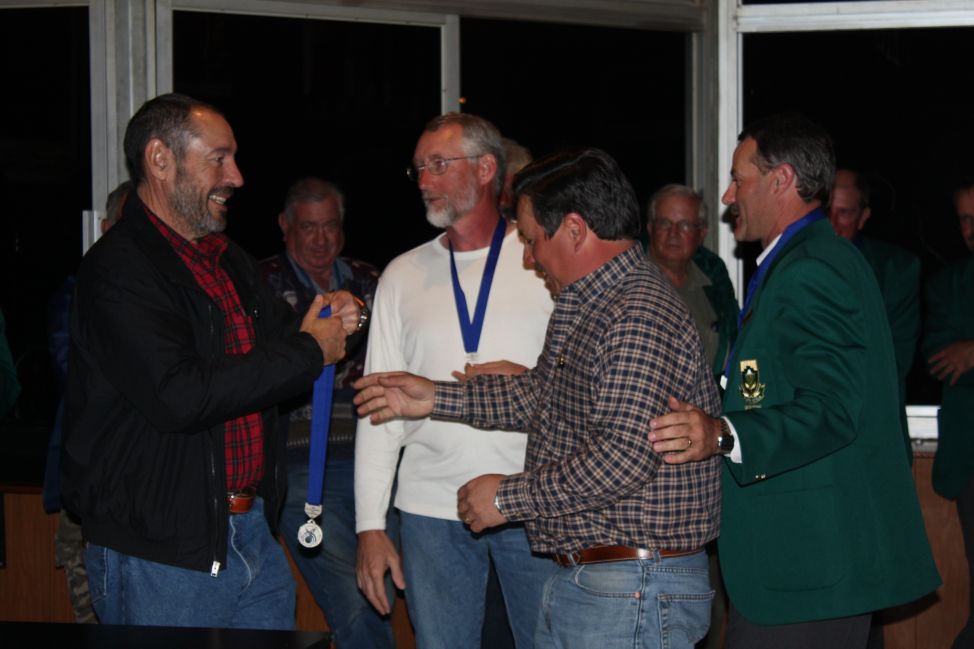 Eugene Kuisis receiving the gold medal from Japie Maritz for 100m Free Rifle |