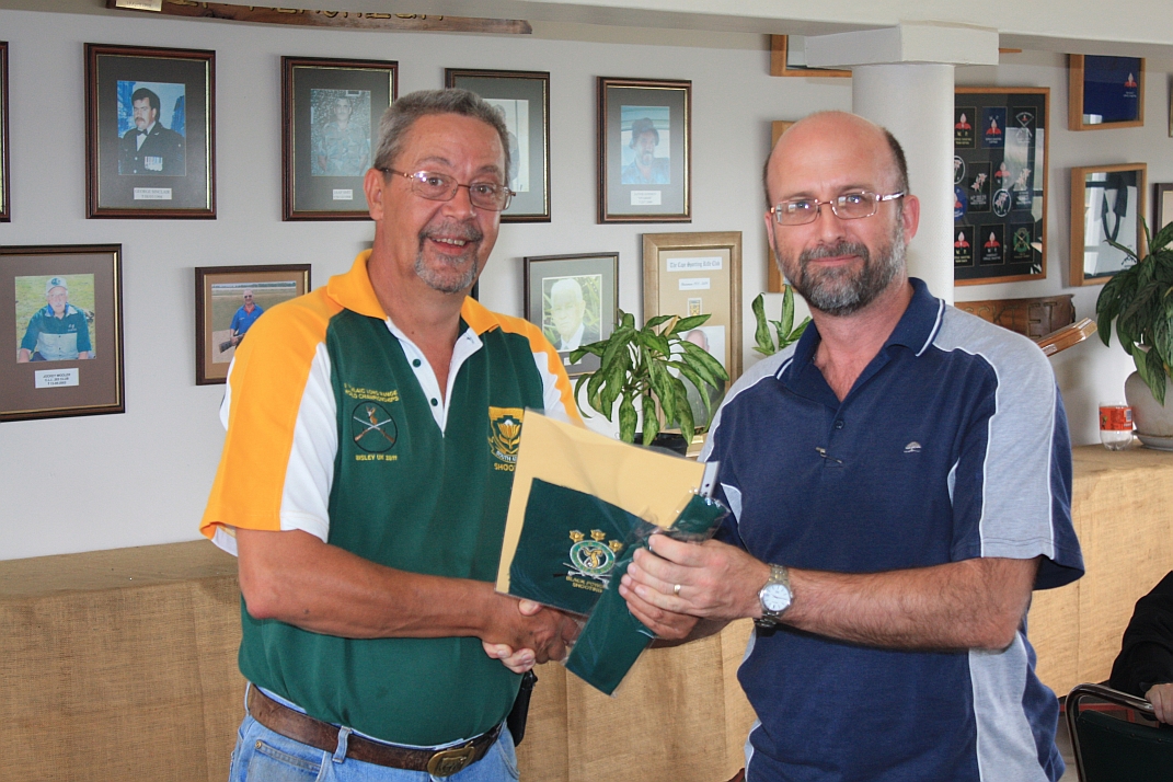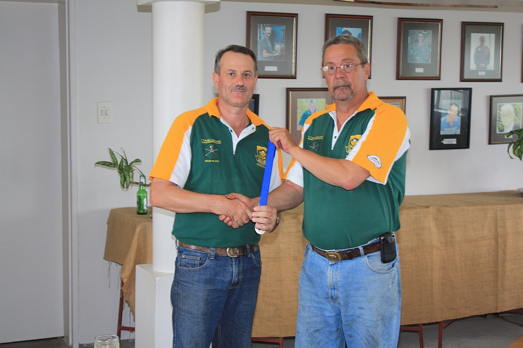 Hubert Heydenrych receiving his BPSU Colours from Merwe van Rensburg for his appointment as Match Director for the MLAIC World Championships in September 2013 |